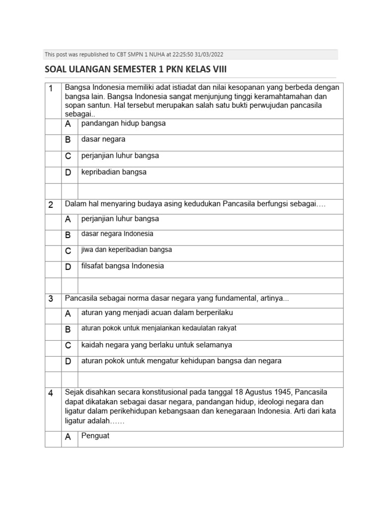 Ulangan semester PPKn biasanya dirancang untuk menguji berbagai tingkat kognitif siswa, mulai dari mengingat fakta, memahami konsep, hingga menganalisis dan mengevaluasi. Berikut adalah beberapa tipe soal yang sering muncul beserta contohnya: